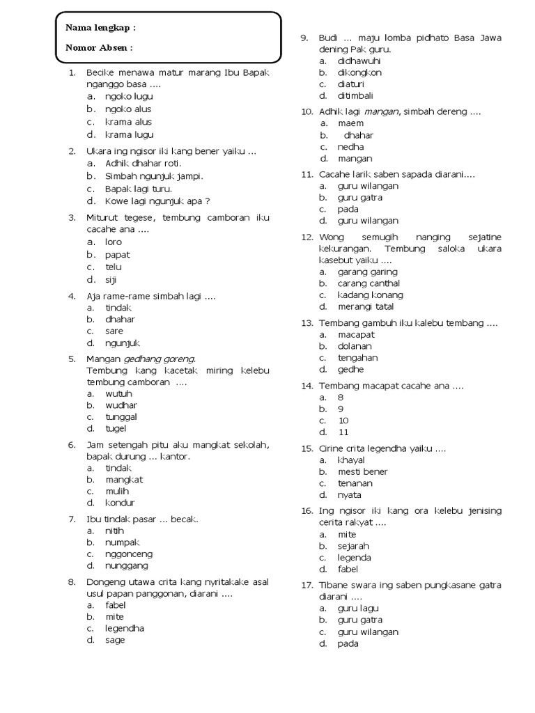 Bahasa Jawa merupakan salah satu kekayaan budaya Indonesia yang perlu dilestarikan. Pembelajaran Bahasa Jawa di sekolah dasar bertujuan untuk mengenalkan siswa pada kearifan lokal, memperkaya kosakata, dan meningkatkan kemampuan berkomunikasi dalam Bahasa Jawa. Semester 2 kelas 4 SD biasanya mencakup materi yang lebih kompleks dibandingkan semester 1, meliputi berbagai aspek seperti membaca, menulis, menyimak, dan berbicara. Artikel ini akan membahas secara detail soal-soal Bahasa Jawa kelas 4 semester 2 yang mencakup berbagai jenis soal dan disertai pembahasannya. Tujuannya adalah untuk membantu siswa dalam memahami materi dan mempersiapkan diri menghadapi ujian.